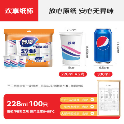 妙洁 纸杯一次性杯子茶水食品级 100只装228ml加厚型